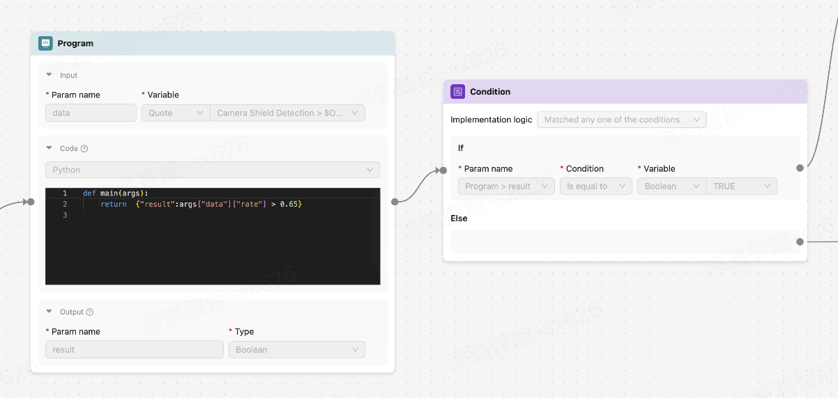 Subsequently, the Program node evaluates the output value of the Camera Shield Detection node. When the obstruction value is greater than 65%, it outputs a True value indicating that the user needs to be alerted. This is determined through the Condition node.
